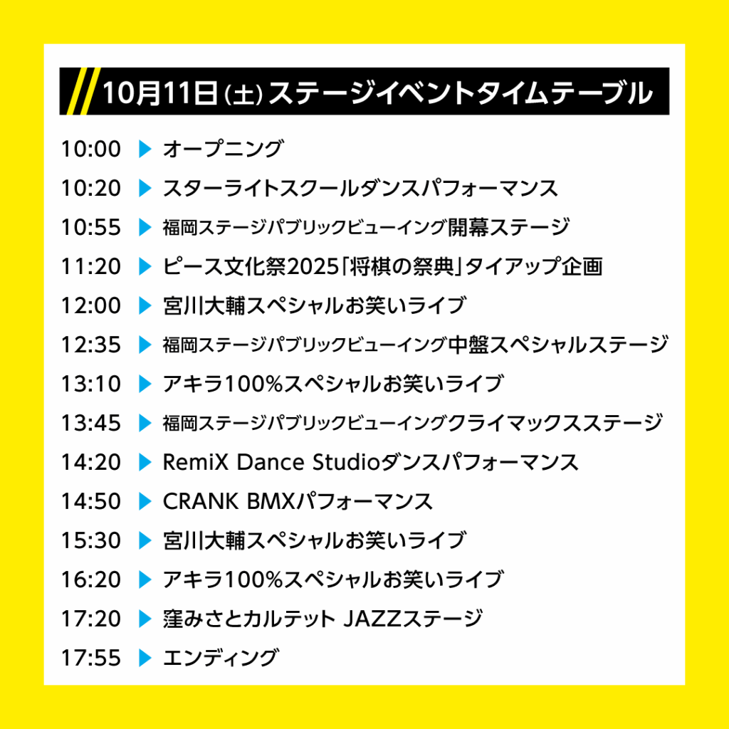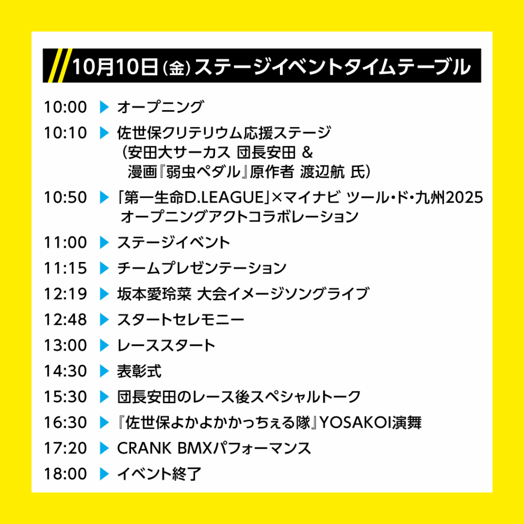 「マイナビ ツール・ド・九州2025佐世保クリテリウム関連イベント」について、当日(10/10(金))及び翌日(10/11(土))のステージイベントのタイムテーブルが決定しましたので、お知らせします。皆様のご来場を心よりお待ちしております。